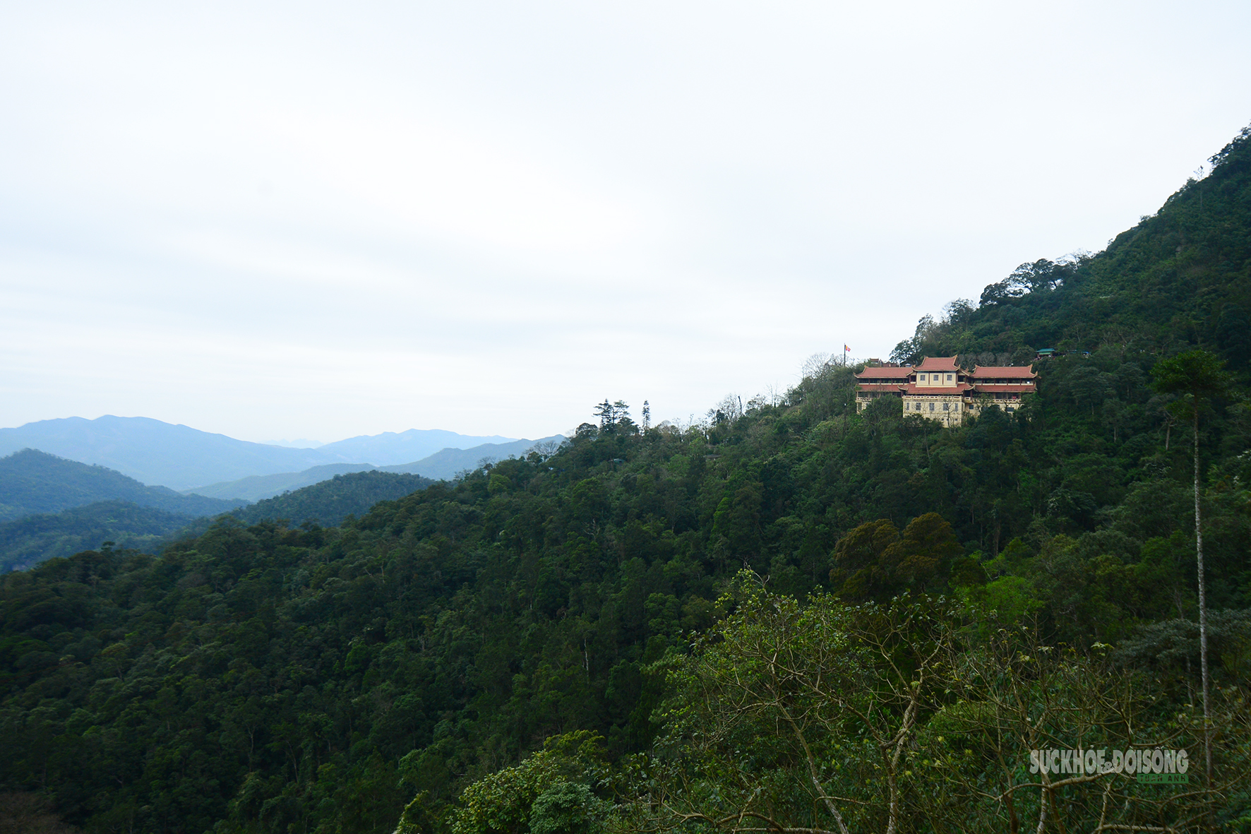 Khu di tích trải dài theo sườn núi với những mái ngói nâu đỏ ẩn hiện giữa màu xanh cây rừng, gợi cảm giác hài hòa và tĩnh tại. Càng lên cao, mây phủ bảng lảng, núi non chập chùng, rừng già bạt ngàn càng tôn thêm vẻ linh thiêng của miền đất Phật.