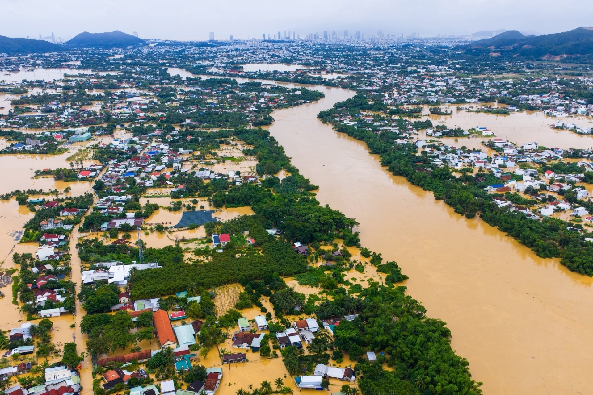 Nước sông Cái dâng cao gây ngập ở nhiều khu vực như phường Tây Nha Trang, xã Diên Điền, Diên Khánh… ngày 17/11. Ảnh: Amazing Nha Trang.