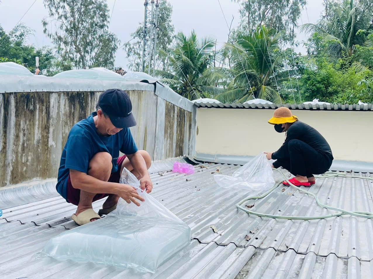 Lực lượng chức năng giúp người dân chằng chống nhà cửa.