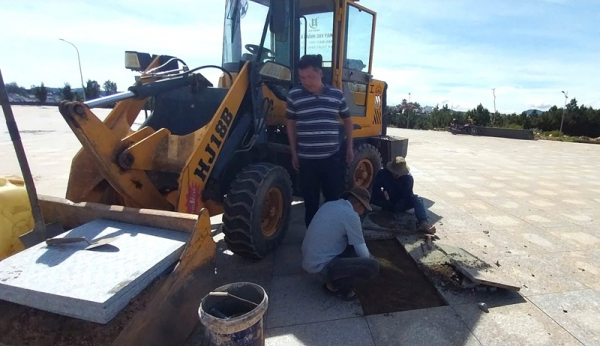 Những viên đá lát ở sân ngoài sân vận động Đà Lạt bị hư hỏng đã được thay thế.