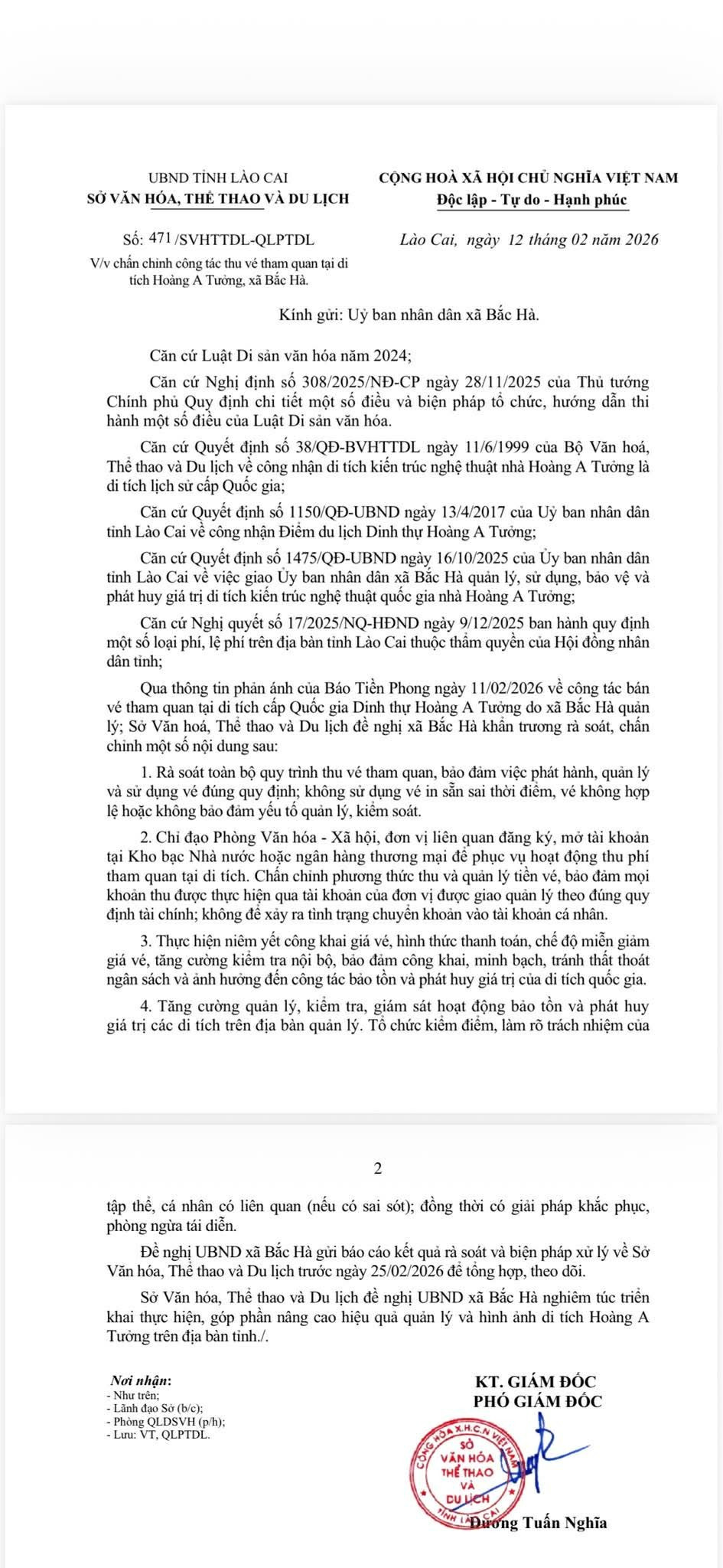 Cụ thể, công văn do Phó Giám đốc Sở Văn hóa Thể thao và Du lịch Lào Cai Dương Tuấn Nghĩa ký ban hành ngày 12/2/2026 nêu nội dung phản ánh của Báo Tiền Phong về công tác bán vé tại di tích cấp Quốc gia Dinh thự Hoàng A Tưởng.