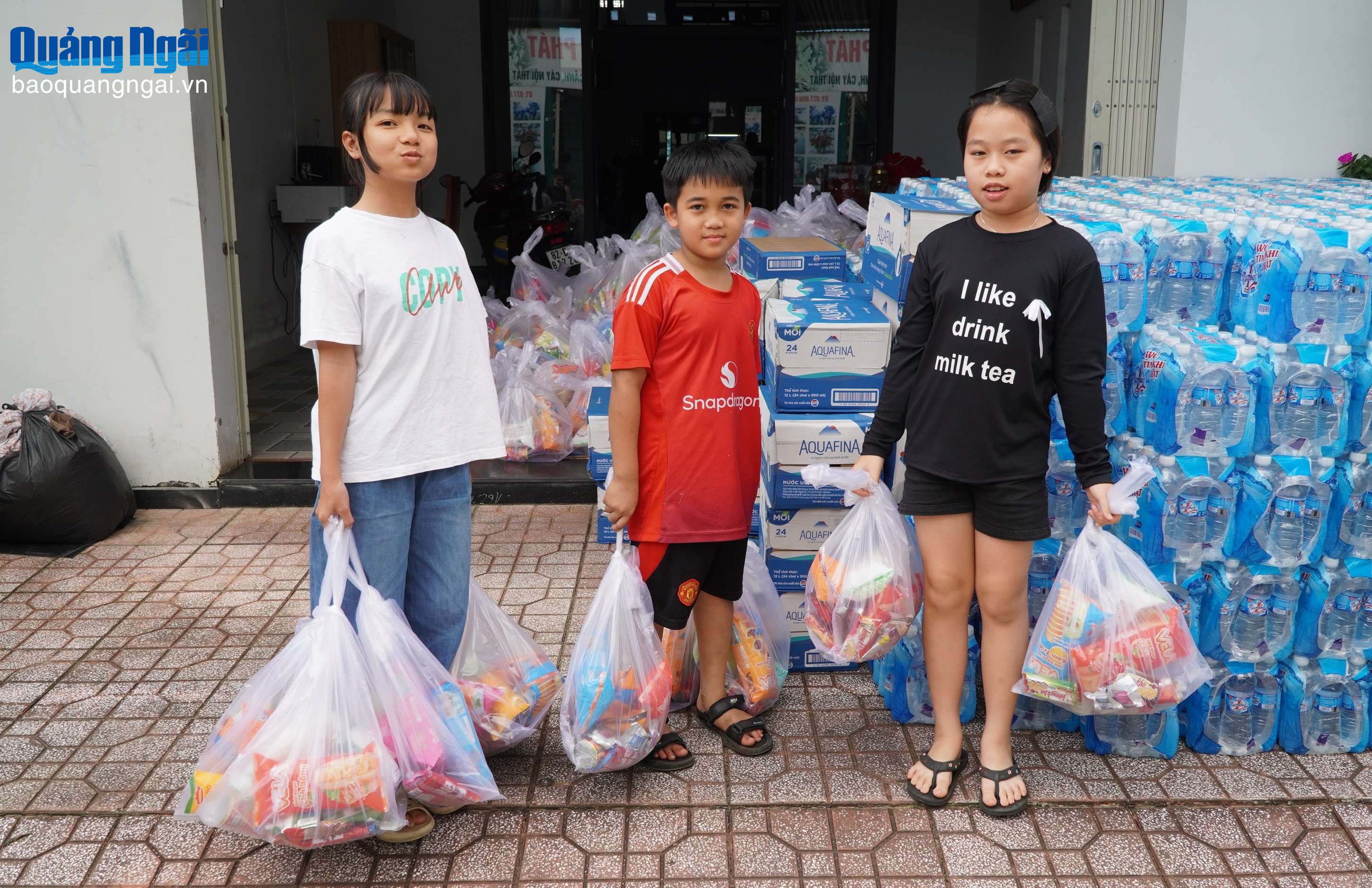 Các tình nguyện viên nhí tham gia xếp hàng hóa cứu trợ.