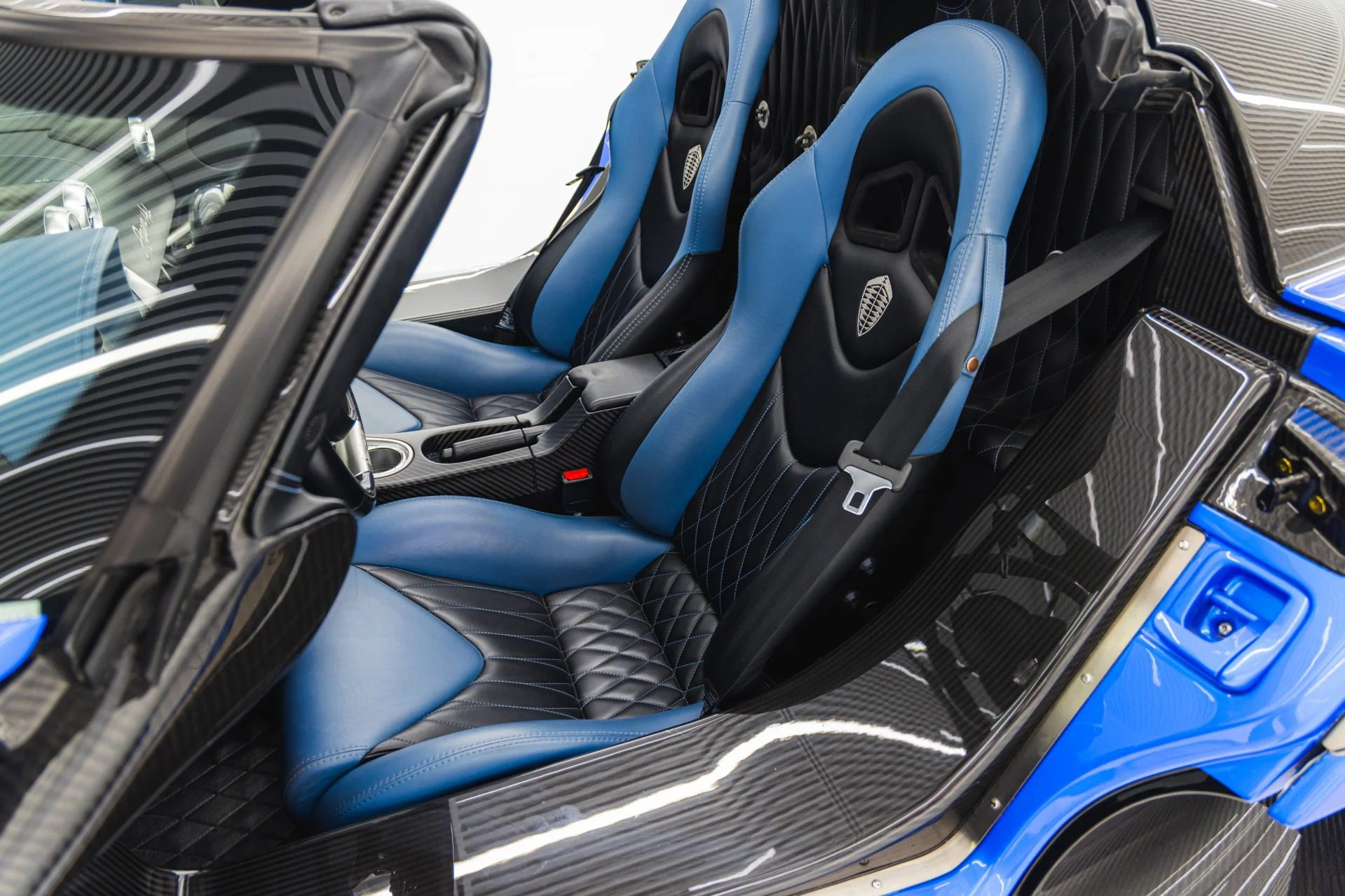 Ghế ngồi của xe được chế tác từ sợi carbon, bọc da cao cấp 2 tông màu đen và xanh. Phần mui bằng sợi carbon có thể tháo rời và cất giữ ở khoang hành lý phía trước.