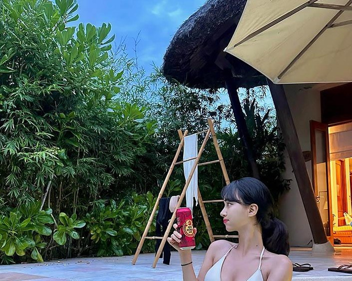 Khi check-in bên hồ bơi vô cực hay bãi biển hoàng hôn, cô luôn trở thành tâm điểm khung hình.